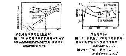 近年來(lái)工程塑料的應(yīng)用越來(lái)越廣泛了,它們大多數(shù)是在樹(shù)脂中摻用無(wú)機(jī)填料的復(fù)合系統(tǒng),這時(shí),用鈦酸酯處理無(wú)機(jī)填料,可以改善材料的機(jī)械強(qiáng)度和潤(rùn)滑性。圖5.10指出,在環(huán)氧樹(shù)脂體系中,摻用以鈦酸酯處理的鈦酸鉀晶須填料,可以改進(jìn)它的沖擊強(qiáng)度,而且效果優(yōu)于硅烷。圖5.11示出該種填料用于酚醛樹(shù)脂系統(tǒng)的效果,即可以使這種材料的摩擦系數(shù)降低。