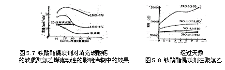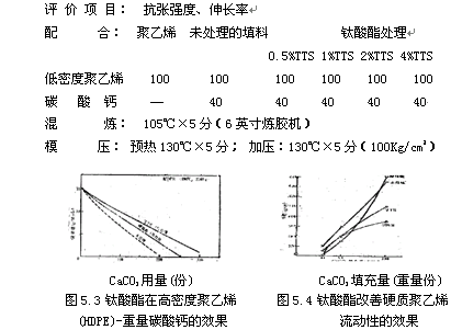 由圖5.4可見(jiàn),在碳酸鈣的填充量高時(shí),鈦酸酯改善流動(dòng)性的效果十分明顯,而圖5.4和圖5.6示出了在硬質(zhì)聚氯 乙烯中使用238S時(shí)所能獲得的沖擊強(qiáng)度改進(jìn),其用量以填料100%計(jì),宜1%-2% ,用量過(guò)高效果反而不好。