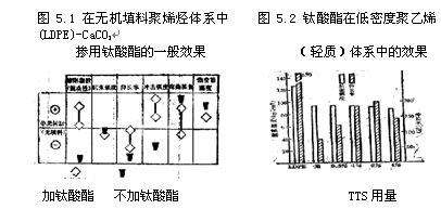 以低密度聚乙烯為例,如圖5.2所示,無(wú)填料的低密度聚乙烯的抗張強(qiáng)度約為130公斤/平方厘米,伸長(zhǎng)率為530%,而填充40份碳酸鈣后,相應(yīng)值為95公斤/平方厘米和80%,改用以鈦酸酯處理的碳酸鈣,可以做到抗張強(qiáng)度不變,而伸長(zhǎng)率增大,鈦酸酯用量以2%為宜。