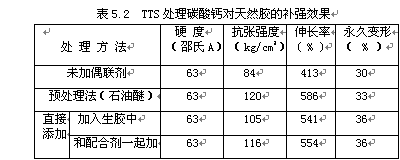 由表5.3可見(jiàn),在熱塑性橡膠中借助于TTS就可以填充高達(dá)50重量份的碳酸鈣,并使抗張強(qiáng)度提高三分之一,定伸強(qiáng)度、伸長(zhǎng)和永久變形保持不變。